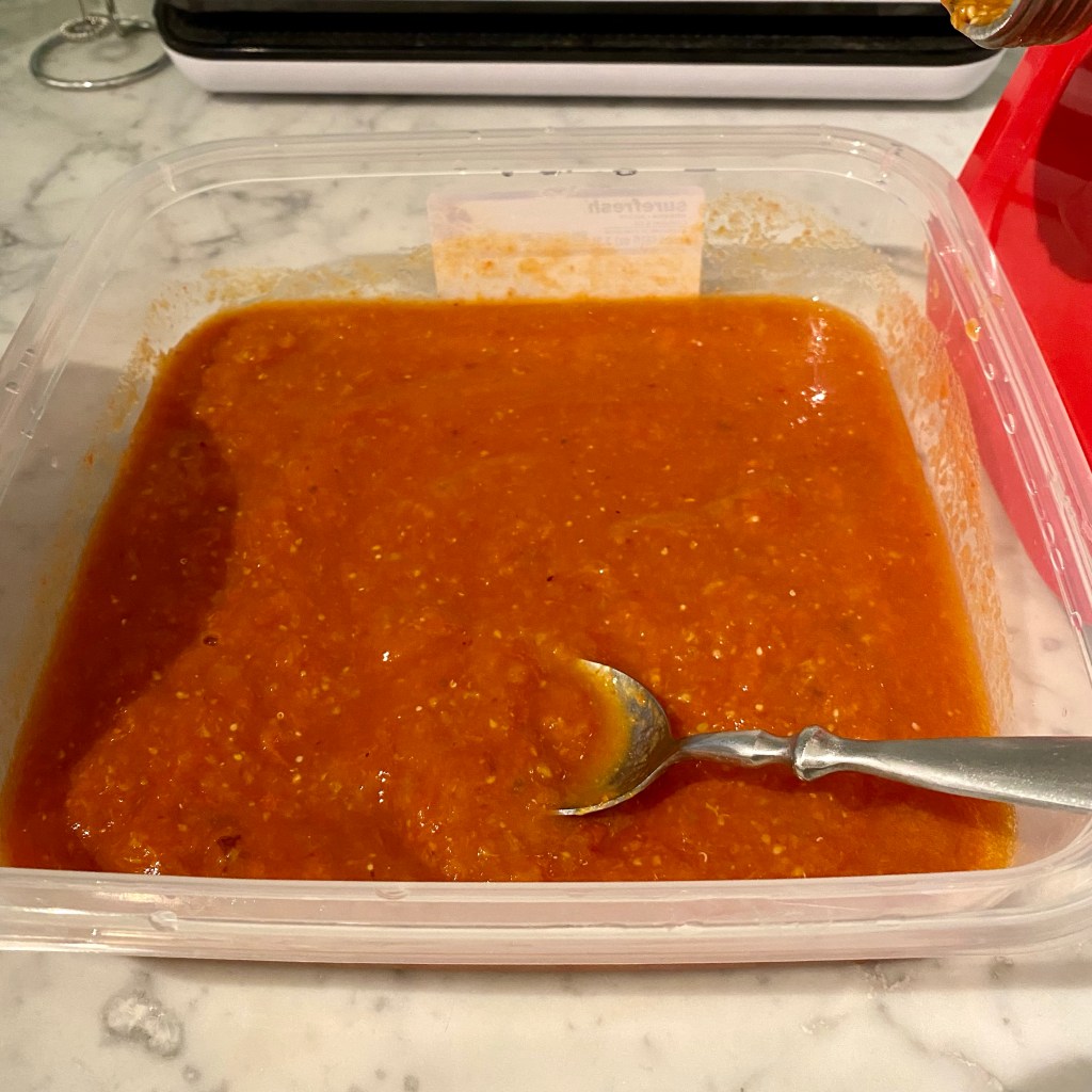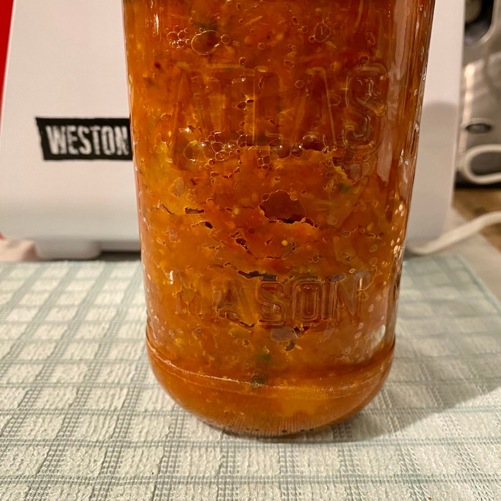 We did a little reducing down because we had to heat the tomato puree to add in the roasted peppers, onion and garlic paste. While that was simmering on low we heated up a few jars (but only ended up needing one…lol) and got the canner ready to go.